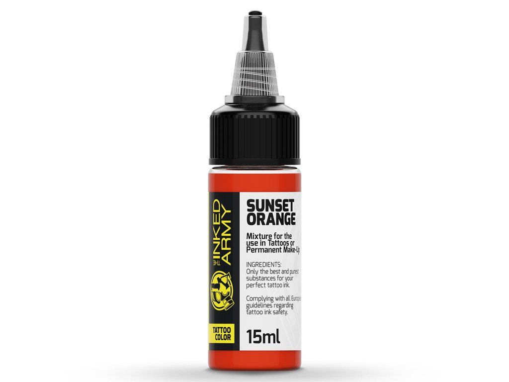 THE INKED ARMY Sunset Orange is een intense oranje uit de serie professionele tatoeagekleuren geproduceerd in Duitsland. Het biedt een warme, levendige tint die ontwerpen energie en diepte geeft.