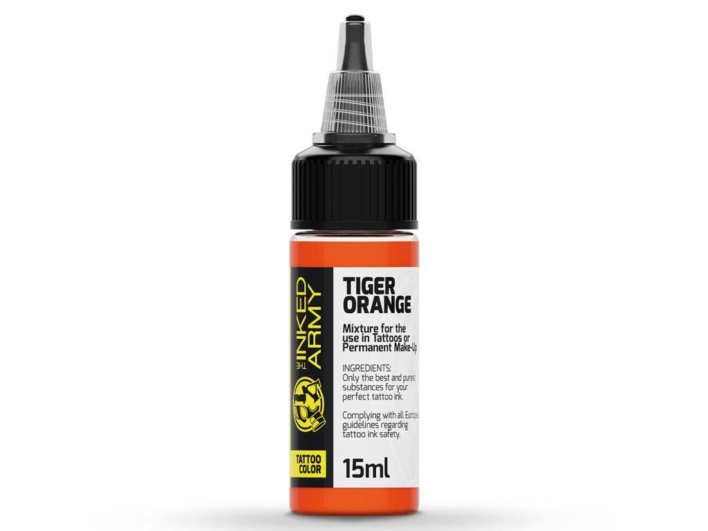 THE INKED ARMY Tijger Oranje is een krachtige, energieke oranje tint uit de serie professionele tatoeagekleuren geproduceerd in Duitsland. Het biedt een heldere, opvallende toon die onmiddellijk de aandacht trekt en het ontwerp levendig maakt.