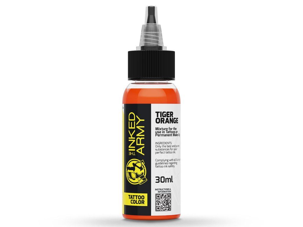 THE INKED ARMY Tijger Oranje is een krachtige, energieke oranje tint uit de serie professionele tatoeagekleuren geproduceerd in Duitsland. Het biedt een heldere, opvallende toon die onmiddellijk de aandacht trekt en het ontwerp levendig maakt.