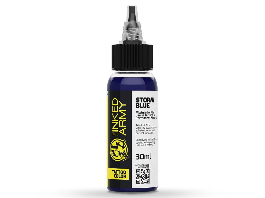 THE INKED ARMY Storm Blue is een intense donkerblauwe kleur uit de serie professionele tatoeagekleuren geproduceerd in Duitsland. Het biedt een volle en stabiele toon die diepte en een sterk visueel contrast mogelijk maakt zonder de noodzaak van zwart.