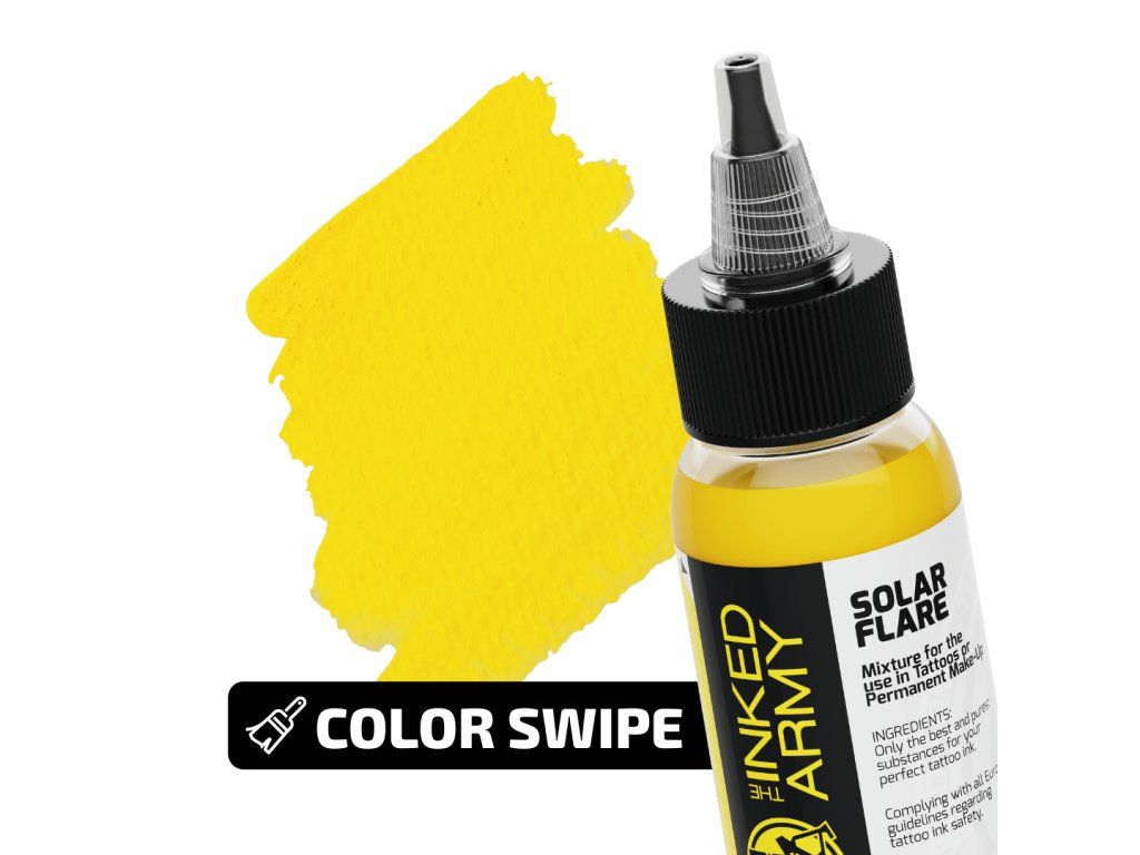 THE INKED ARMY Solar Flare is een heldere, energieke tint geïnspireerd op een zonnevlam. Het combineert warme tinten geel en oranje voor maximale visuele intensiteit en een sterk contrast.