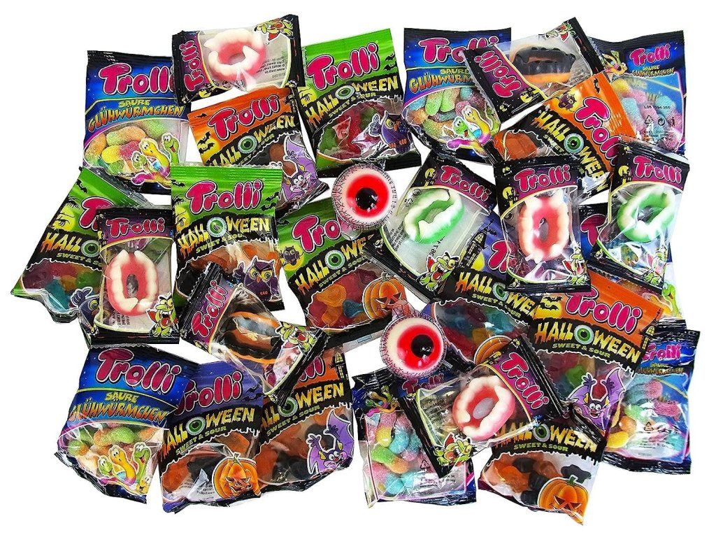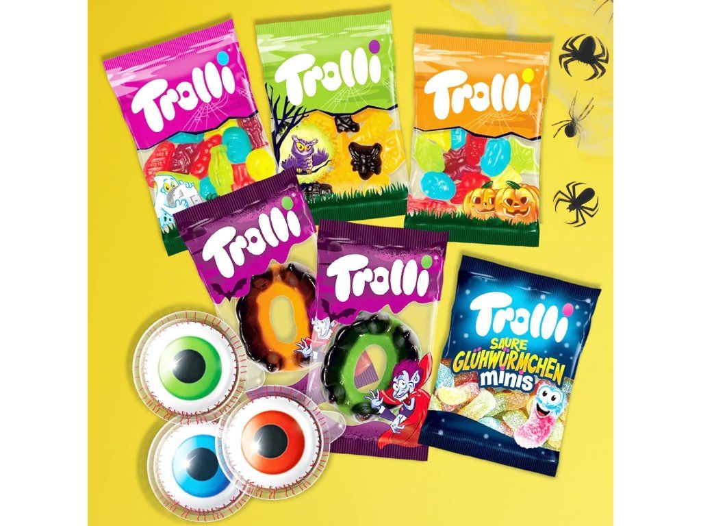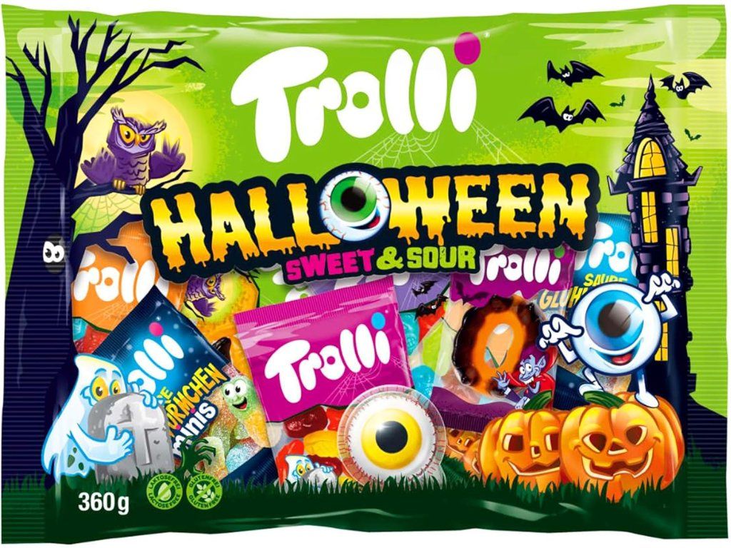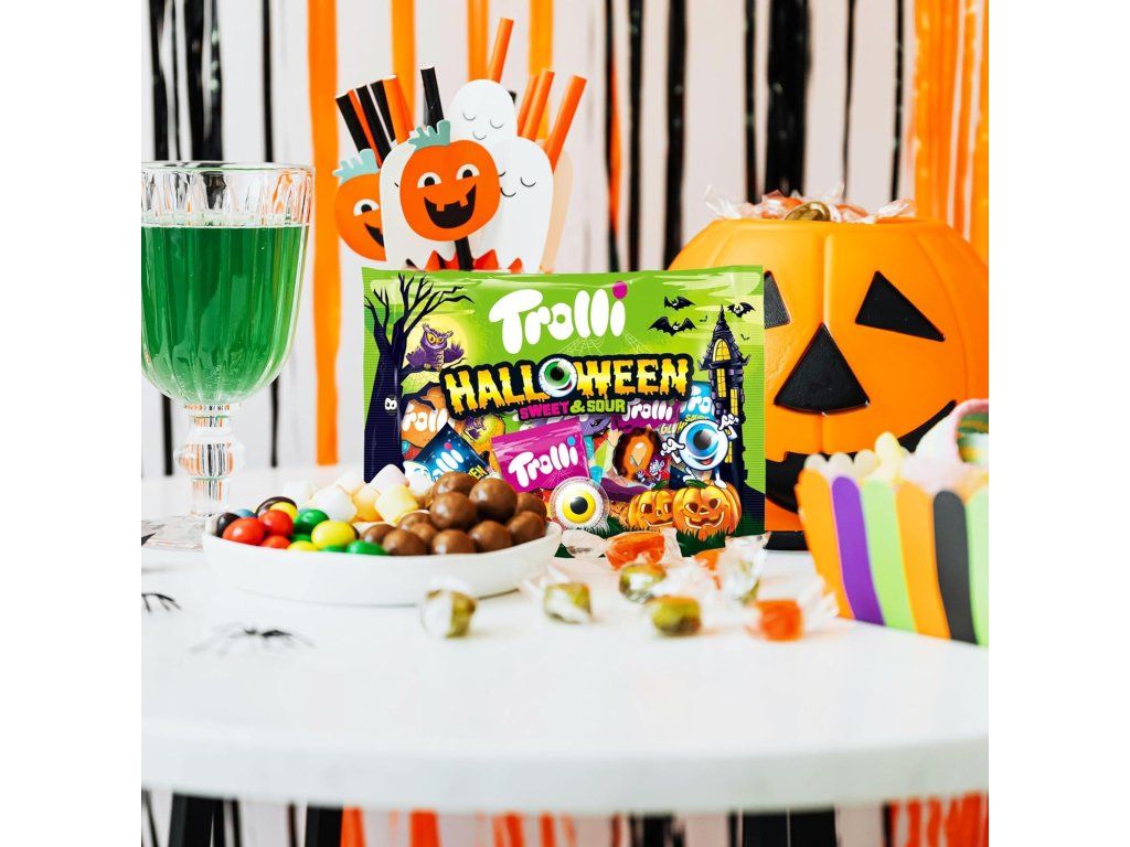Trolli Halloween Party Mix zorgt voor het ultieme griezelige snoepgenot. Elke verpakking bevat een selectie van zoete en zure gelei snoepjes en marshmallows in thematische vormen – Glotzer, Sour Worms of Dracula. Perfect voor Halloweenfeesten, cadeaus en om samen met vrienden van te snoepen.