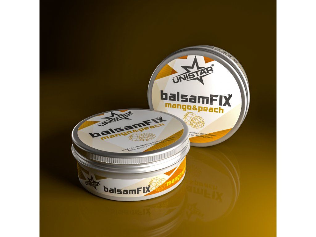 UNISTAR balsamFIX is tattoo butter met een frisse geur van mango en perzik. Het heeft kalmerende en hydraterende effecten op de huid tijdens het tatoeageproces. De ingrediënten bieden voedende en beschermende eigenschappen en bevorderen de genezing van verse tatoeages.